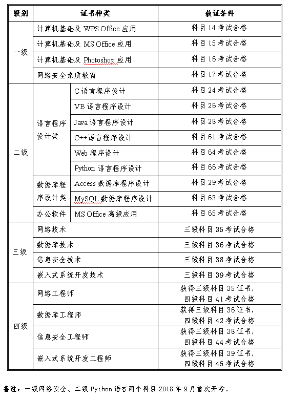 全国计算机等级考试证书体系(2018版)
