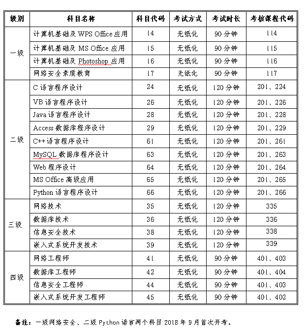 全国计算机等级考试科目设置(2018版)