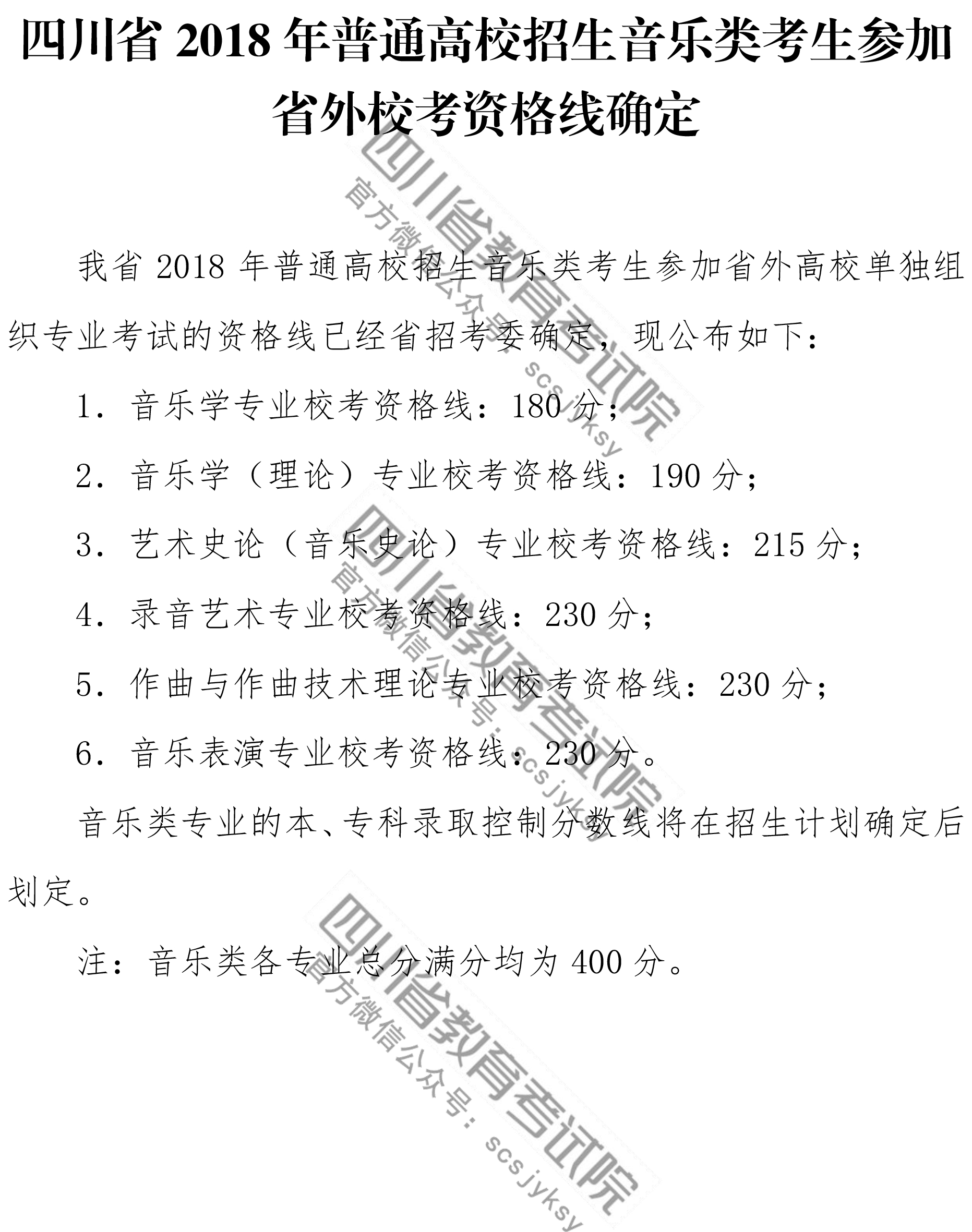 四川省2018年普通高校招生音乐类考生参加省外校考资格线确定