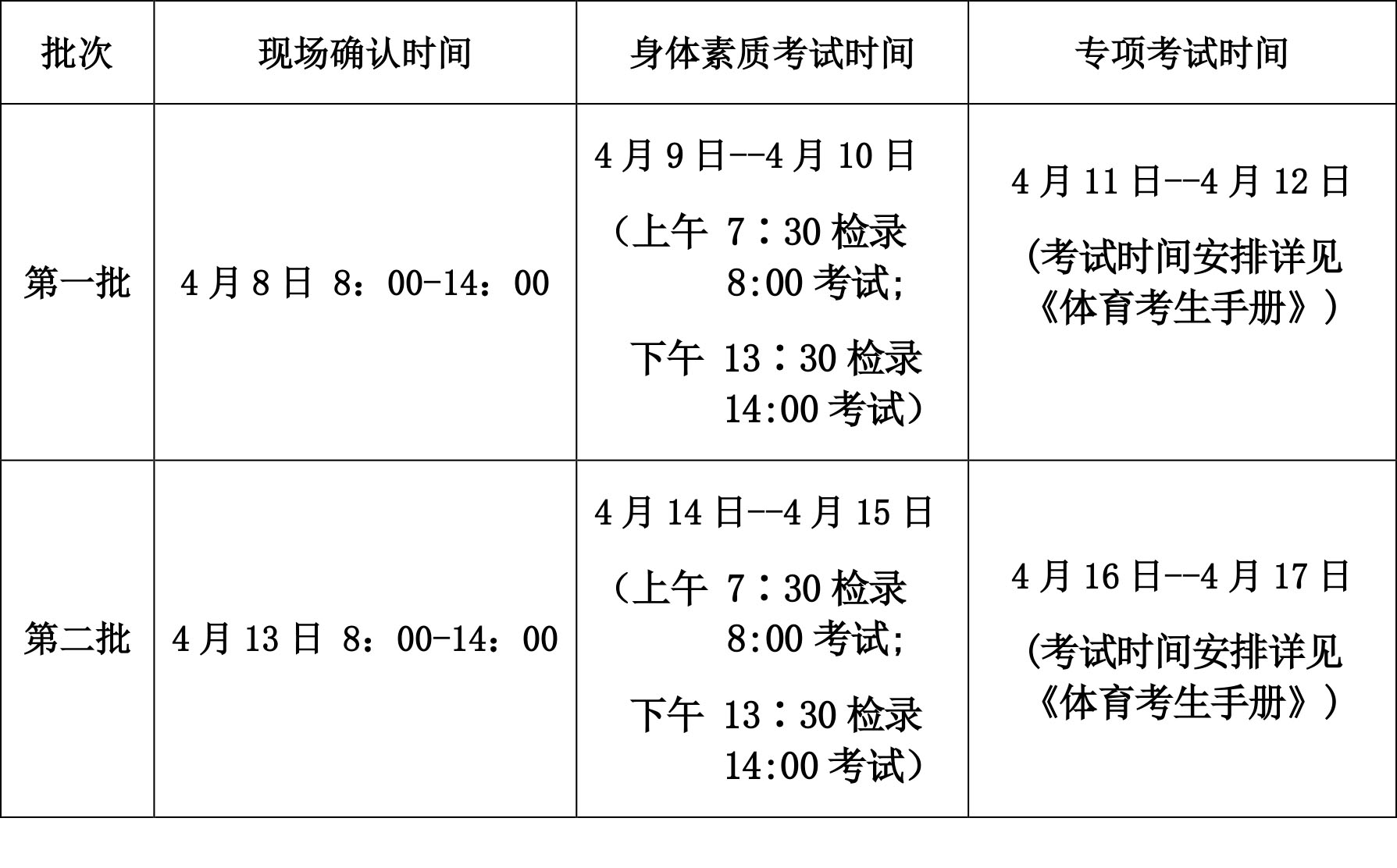 一、考生持《准考证》和二代居民身份证(以下简称《身份证》)到成都体育学院球类训练馆前报到,领取《体育考生手册》。考试时间安排如下: