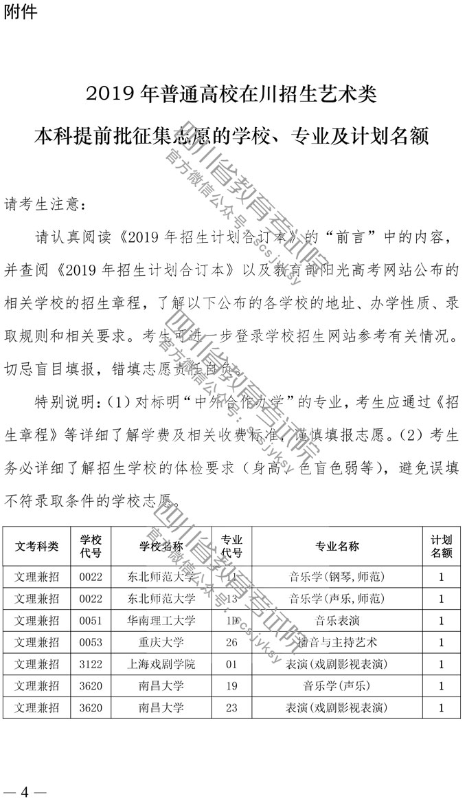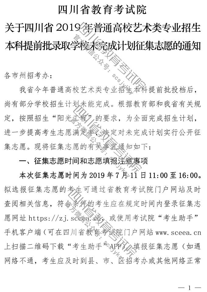 关于普通高校艺术类专业招生本科提前批录取学校未完成计划征集志愿的通知