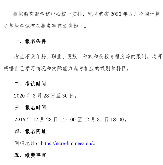 四川省2020年3月全国计算机等级考试(NCRE)报考公告
