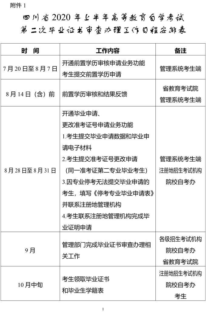 1.四川省2020年上半年高等教育自学考试第二次毕业证书审查办理工作日程安排表