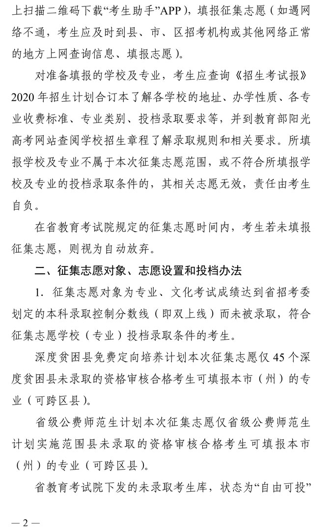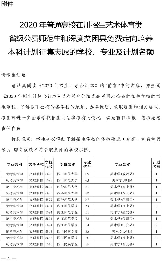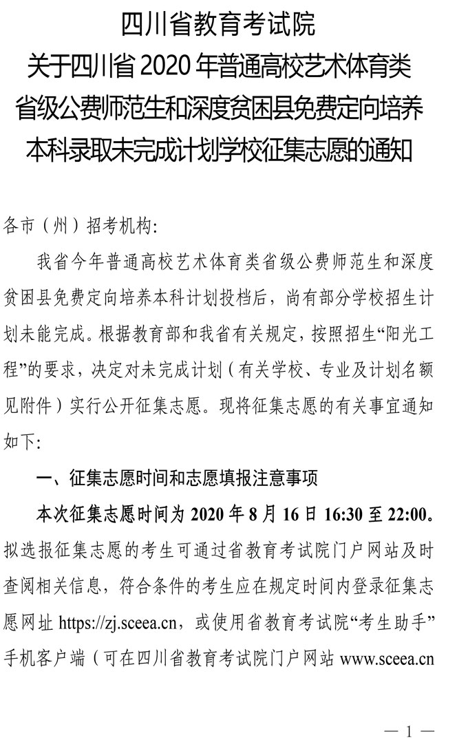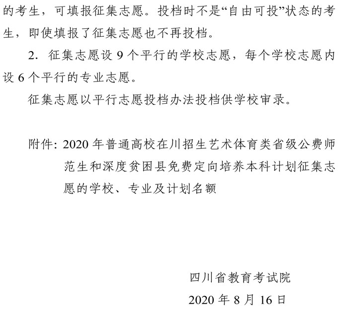 关于四川省2020年普通高校艺术体育类省级公费师范生和深度贫困县免费定向培养本科录取未完成计划学校征集志愿的通知