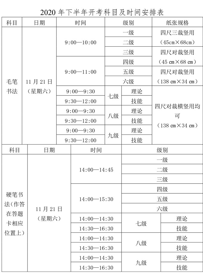 2020年下半年书画等级考试将于11月21日至22日举行,现将我省报考有关事宜通告如下。