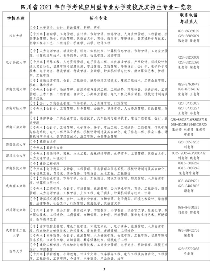 自学考试是我国高等教育的重要组成部分,是个人自学、社会助学和国家考试相结合的高等教育形式。为促进自学考试持续健康发展,省招考委、教育厅同意四川大学等58所高等学校为我省2021年高等教育自学考试应用型专业的主考学校,并开展自学考试助学工作,现将有关高等学校、主考专业及相关情况通告如下: