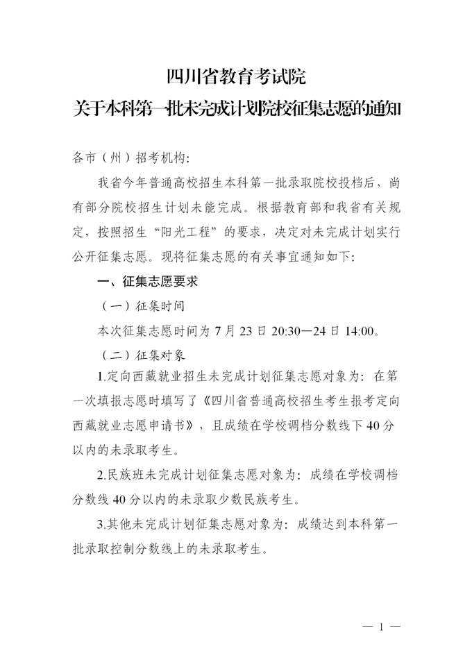 关于本科第一批未完成计划院校征集志愿的通知
