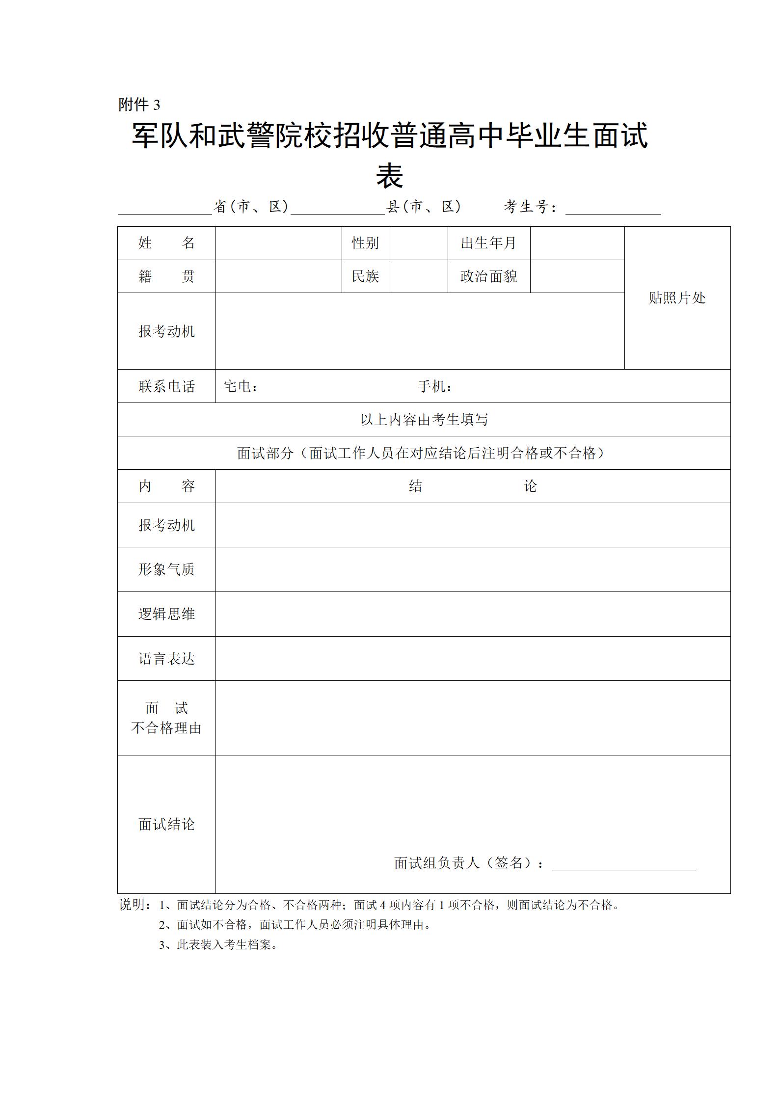(二)考核程序。1.普通高级中学组织有报考军队院校意愿的毕业生填写政治考核表,报所在县、市、区教育部门(拟报考军队院校对政治条件有特别要求专业的(如战略支援部队信息工程大学)普通高中毕业生,应主动申报,以便于及时开展走访调查,否则将影响投档录取)。2.县、市、区教育部门将政治考核对象名单和政治考核表报送所在县、市、区兵役机关。3.县、市、区兵役机关按照《军队征集和招录人员政治考核规定》(军法〔2021〕62号),会同同级公安机关于10个工作日内,完成政治考核。4.县、市、区兵役机关于面试和体检工作开始前,将政治考核情况逐级上报至省军区战备建设局,省军区战备建设局将政治考核通过人员名单提供给省高等学校招生考试委员会办公室。