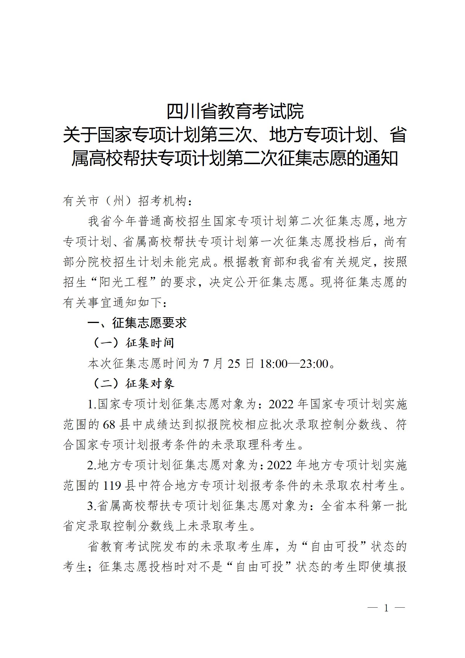 关于国家专项计划第三次、地方专项计划、省属高校帮扶专项计划第二次征集志愿的通知