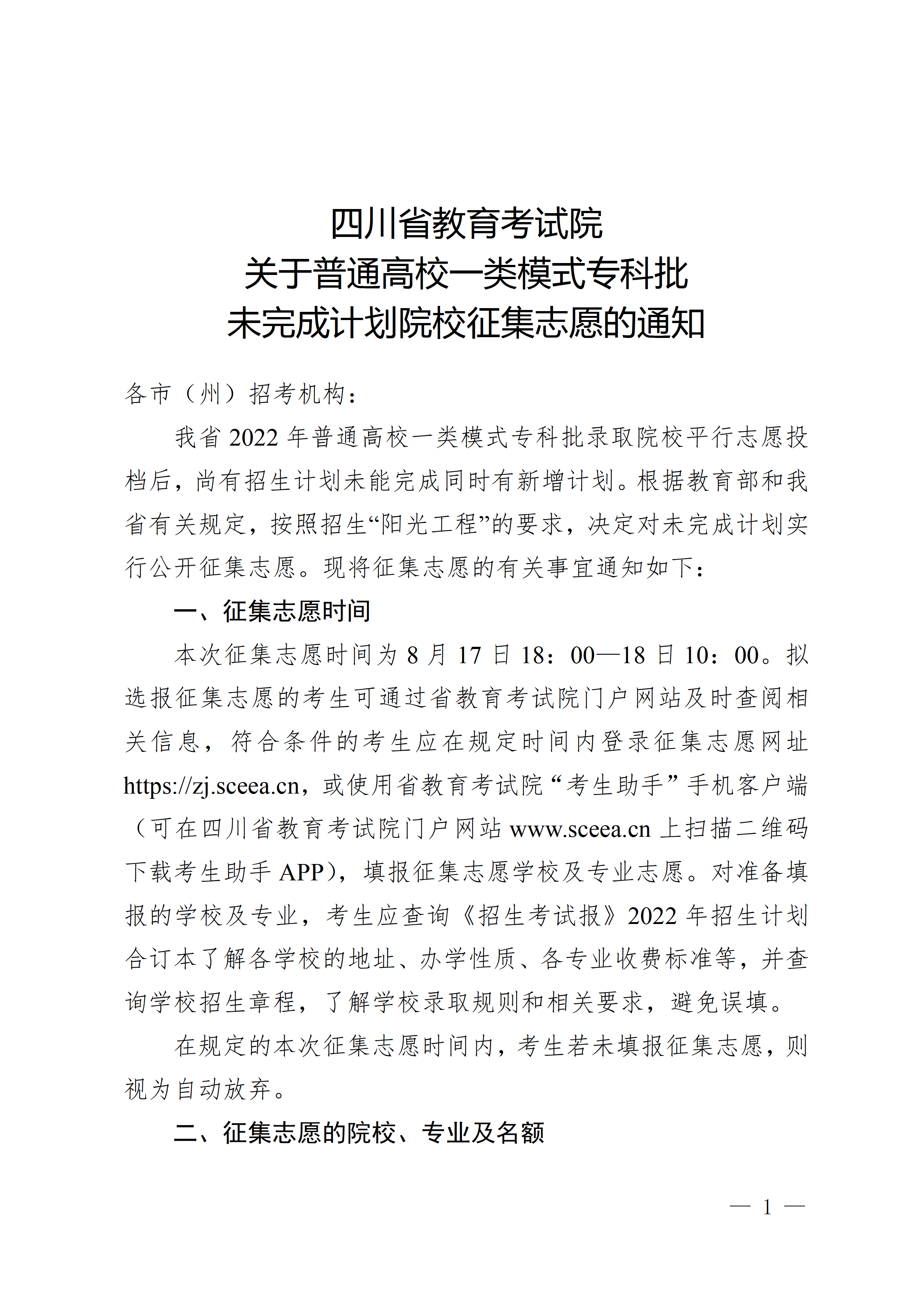 关于普通高校一类模式专科批未完成计划院校征集志愿的通知