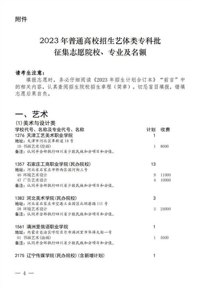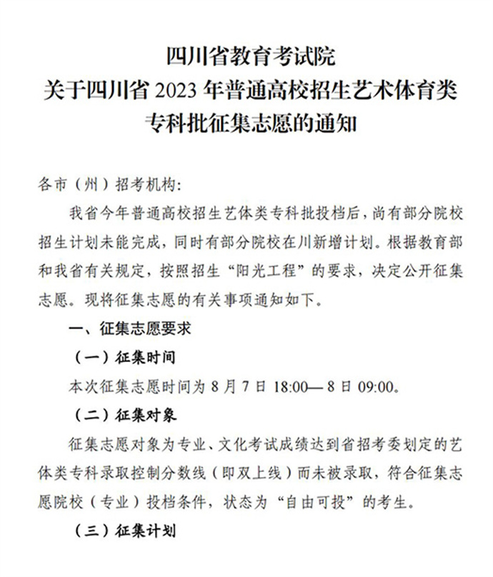 关于四川省2023年普通高校招生艺术体育类专科批征集志愿的通知