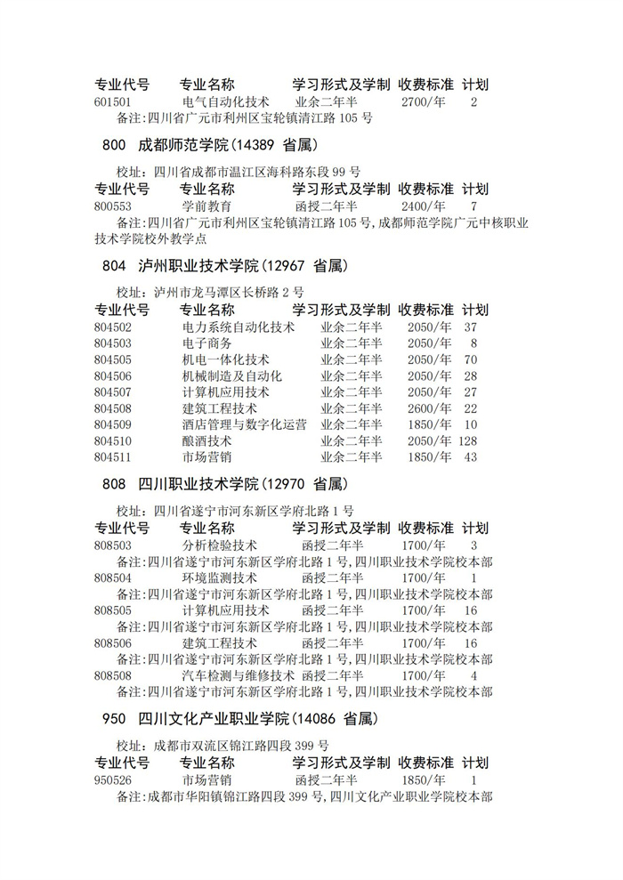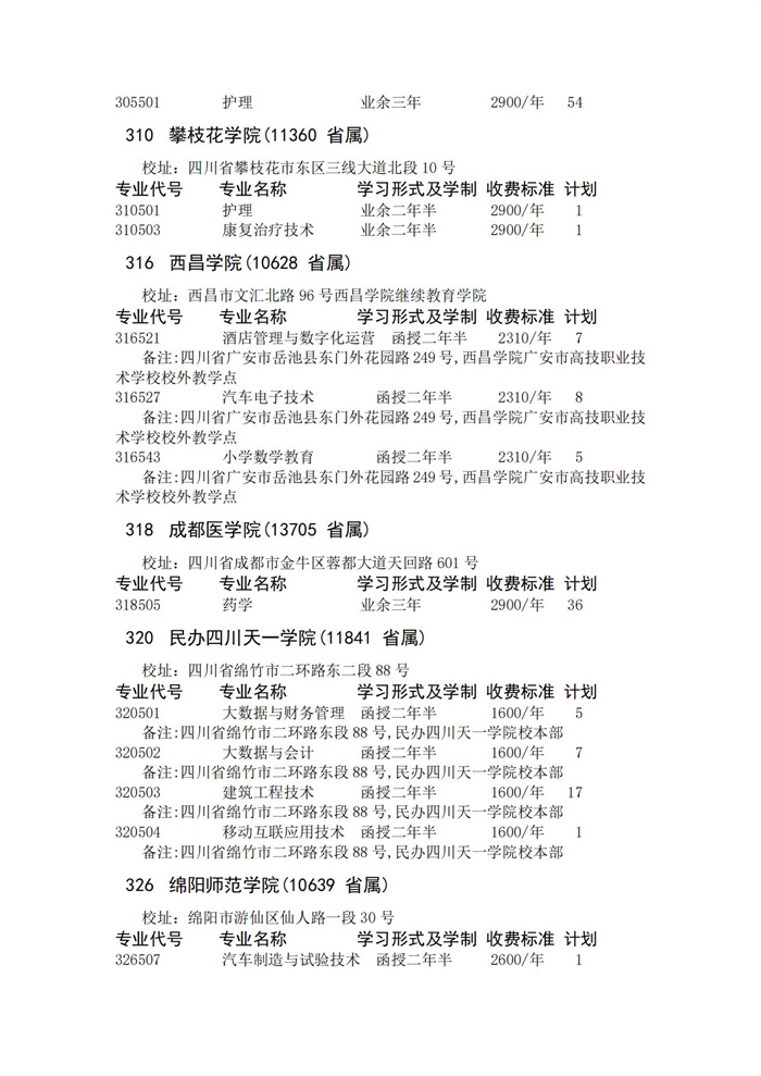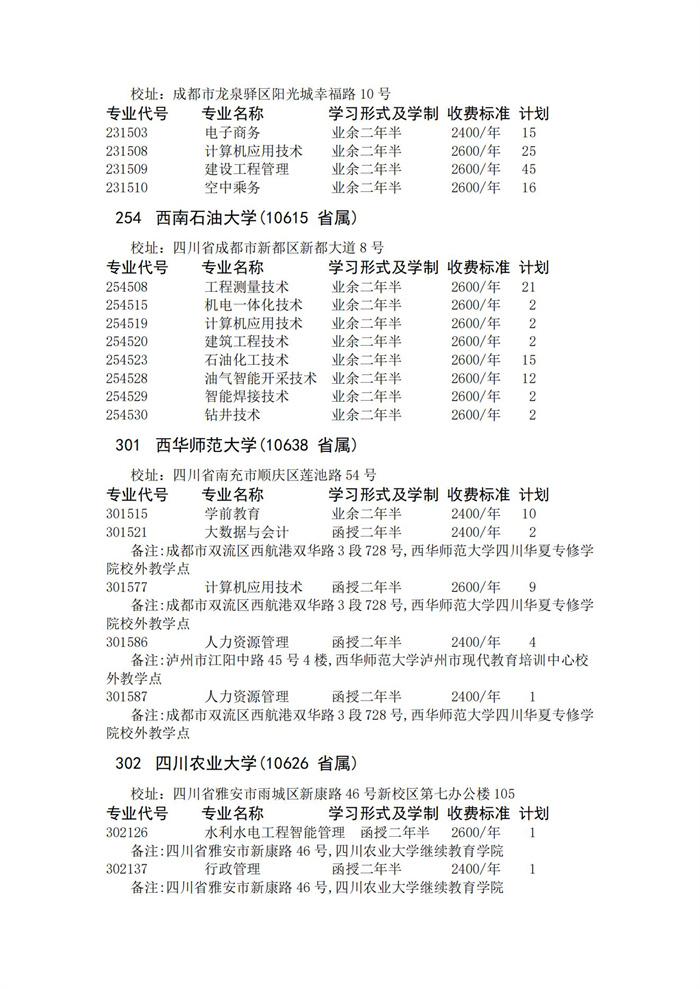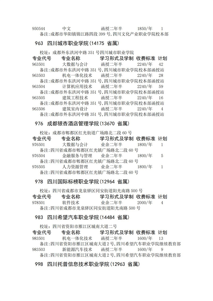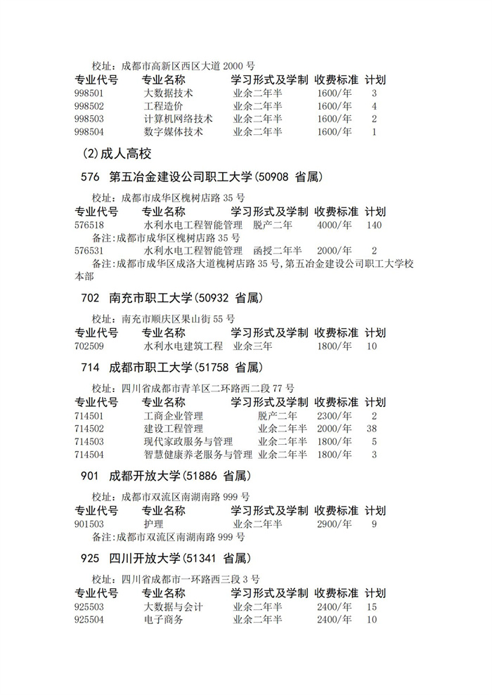 四川省2023年成人高校招生录取征集志愿的院校、专业及名额