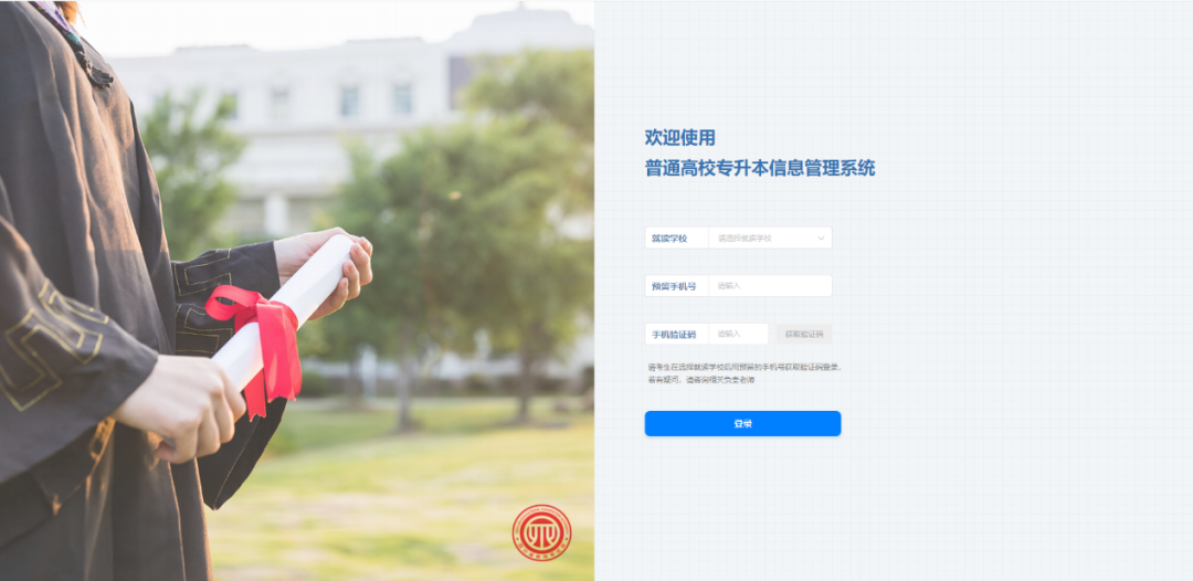 考生在电脑端使用最新版主流浏览器(建议选择谷歌浏览器或360浏览器)登录省教育考试院官网(//m.dye-commerce.com),根据网站提示进入“普通高校专升本信息管理系统”;或直接在浏览器输入网址:https://sczsb.sceea.cn/web/stu/,按回车键即可进入“普通高校专升本信息管理系统”。页面如下: