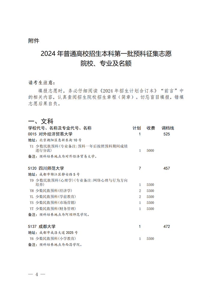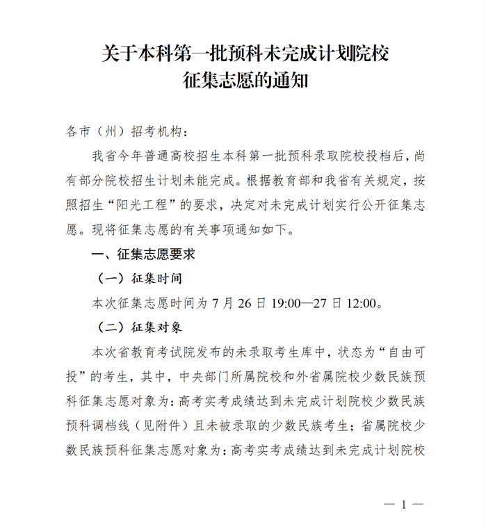 关于本科第一批预科未完成计划院校征集志愿的通知