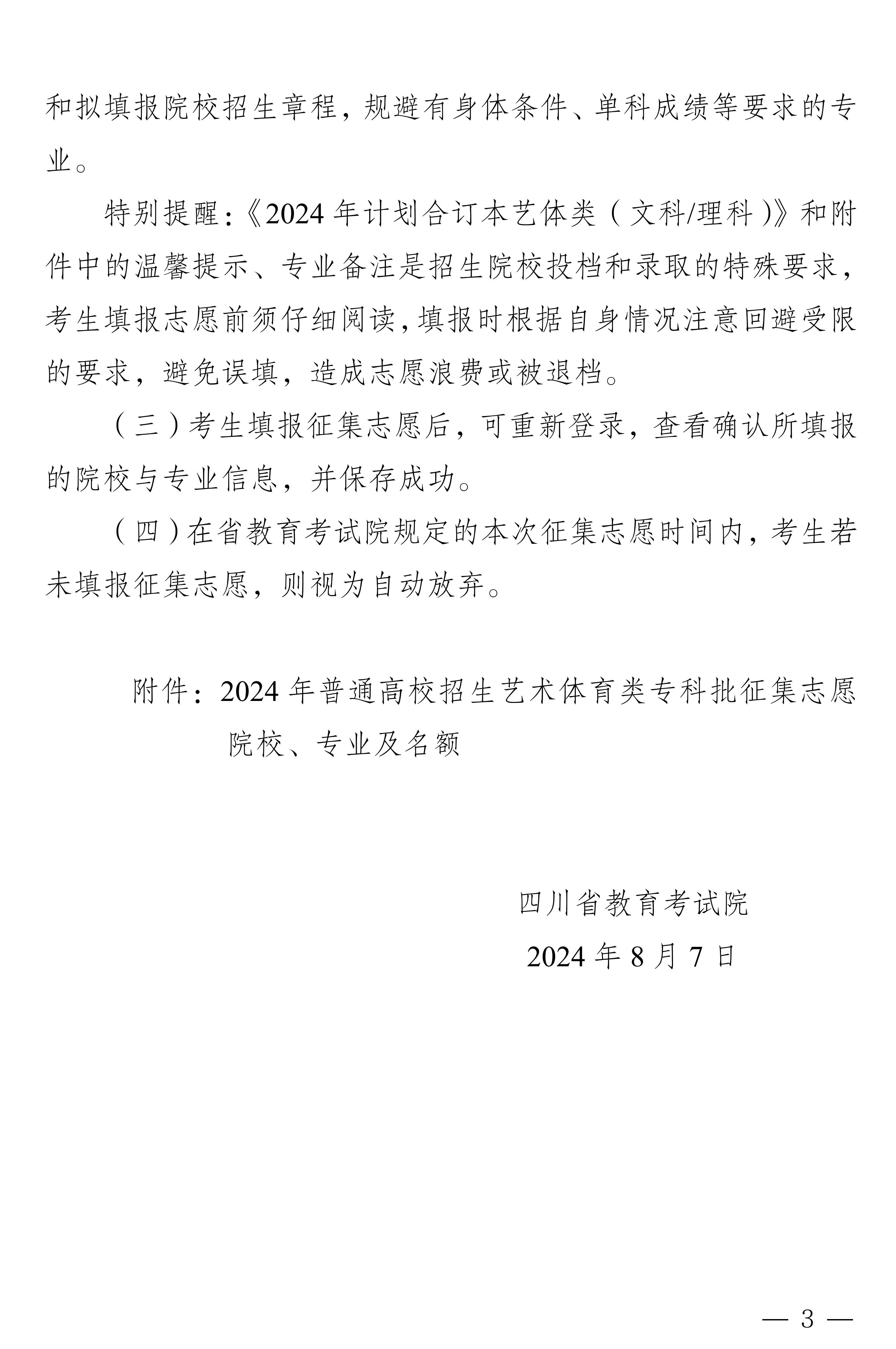 关于我省2024年艺术体育类专科批未完成计划院校征集志愿的通知