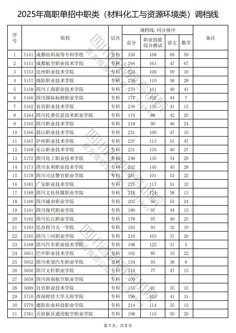 2025年高职单招中职类(材料化工与资源环境类)调档线