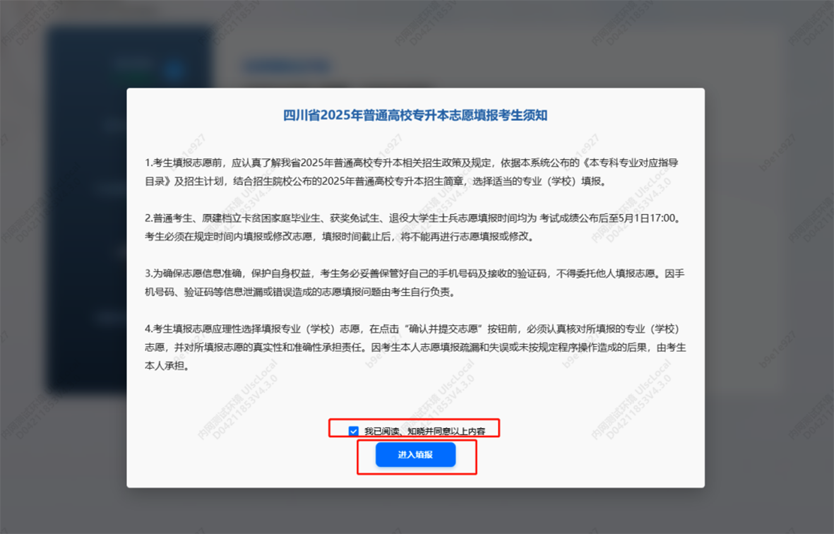 请考生仔细阅读须知内容,在弹窗最下方勾选“我已阅读、知晓并同意以上内容”后,再点击“进入填报”按钮进入填报主页。