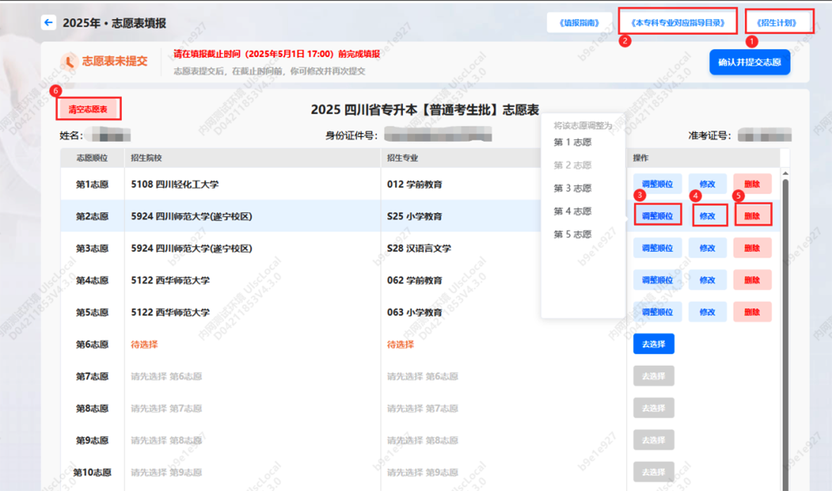 若您想查询今年的普通高校专升本招生计划,可点击志愿表上方的“招生计划”(红框1)查看;若您想查看本人就读专业对应的本科专业,则可点击志愿表上方的“本专科专业对应指导目录”(红框2)查看。若您想调整所选志愿次序,可点击对应志愿的“调整顺位”(红框3)按钮;若您想修改所选志愿,可点击对应志愿的“修改”(红框4)按钮;若您想删除所选志愿,可点击对应志愿的“删除”(红框5)按钮;若您想删除所有志愿,可点击志愿表左上方的“清空志愿表”(红框6)按钮;各红框位置如下图所示: