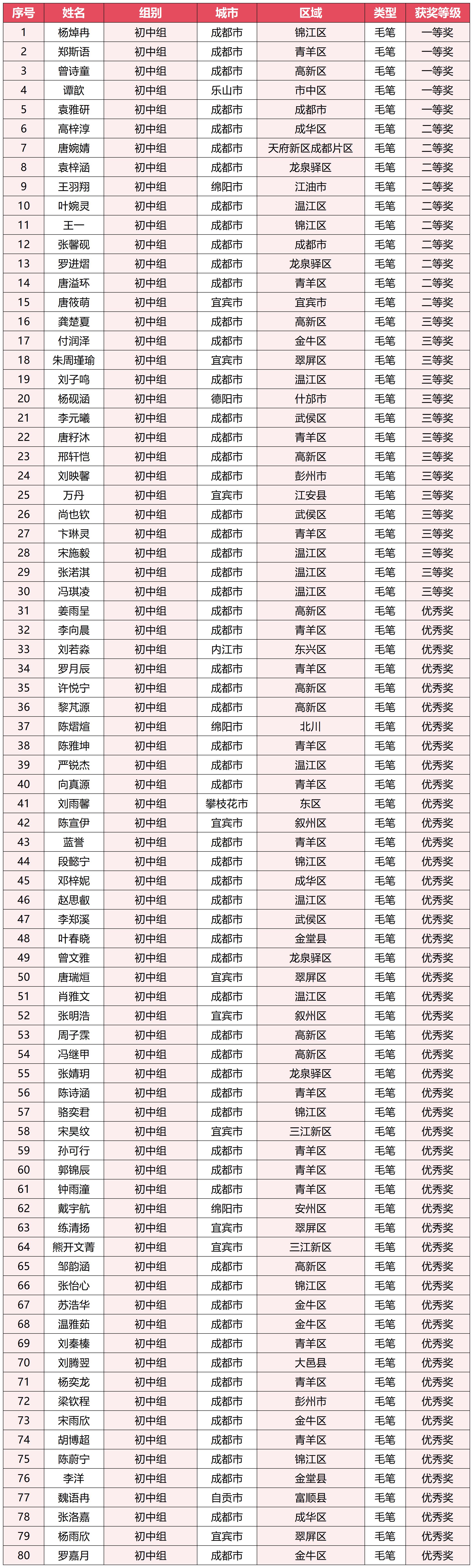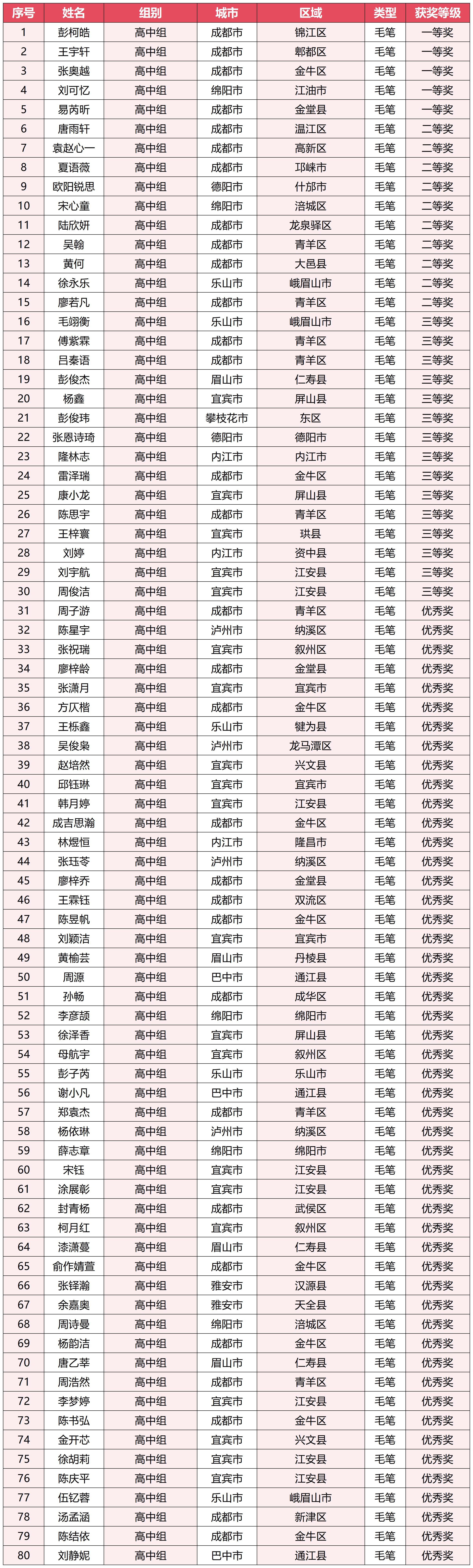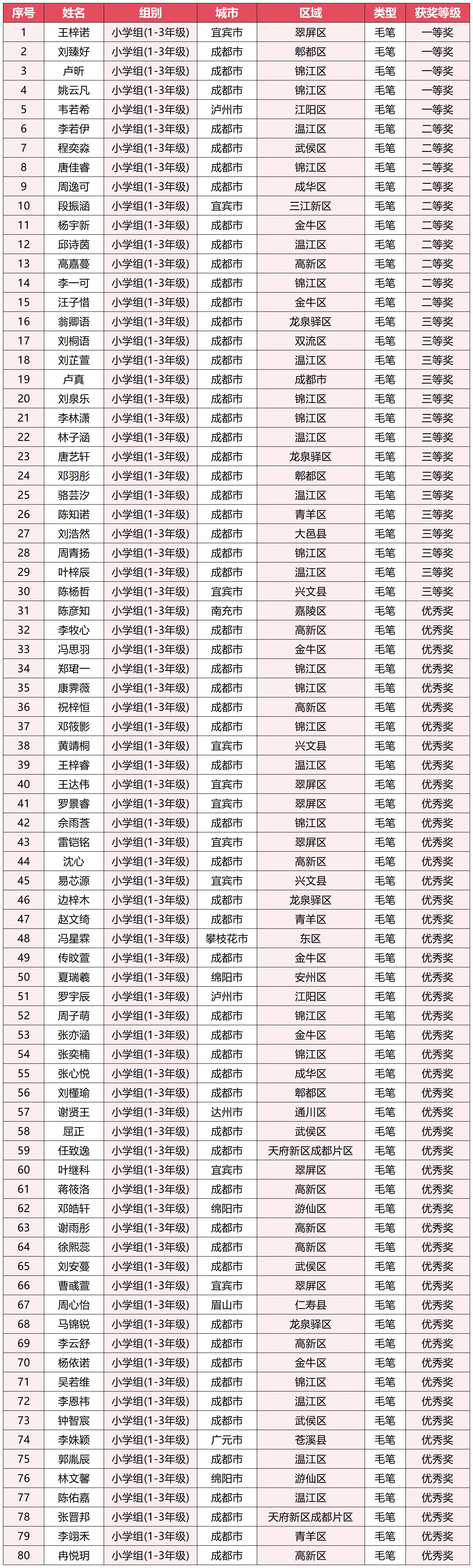 我省第二届中小学师生“书法人生·墨香校园”主题书法大展公益活动评选工作已圆满结束。经过评审专家组初评和复评,已评选出毛笔类和硬笔类的一、二、三等奖和优秀奖,现予以公示,公示期为7月14日至7月18日(共5个工作日)。公示期间,任何单位或个人如对获奖名单有异议,均可通过电话形式反映,举报电话:028-86654294。