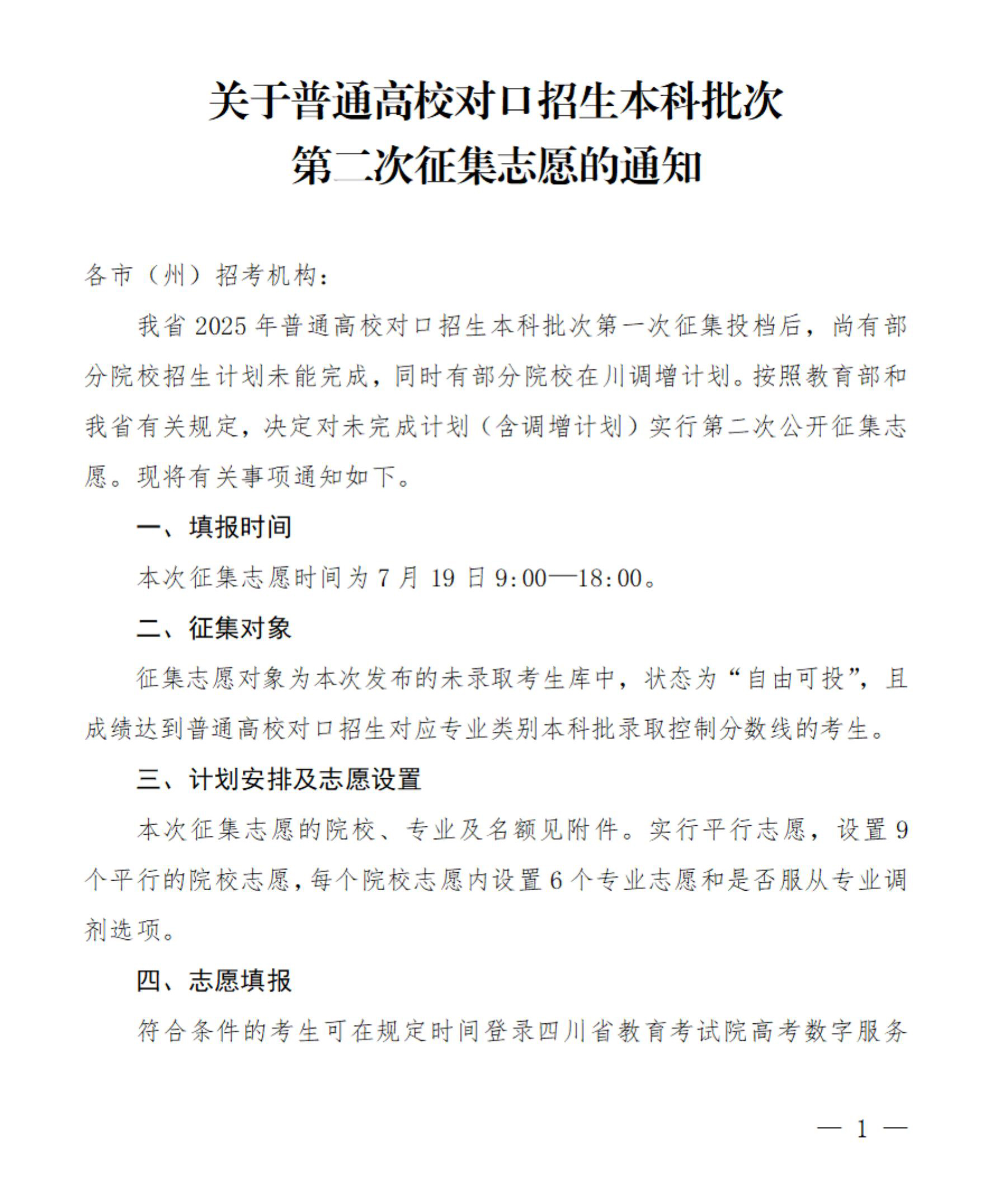 关于普通高校对口招生本科批次第二次征集志愿的通知
