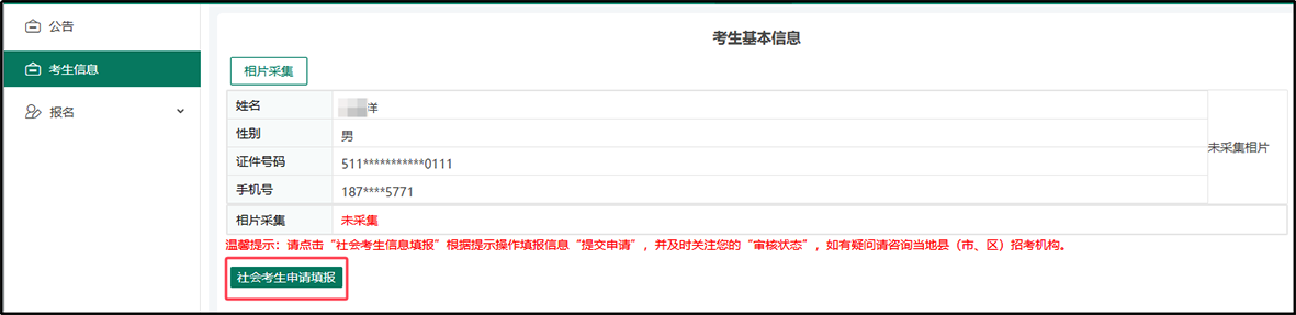 社会考生,应先进行报名资格申报,审核通过才能进入报名信息填报,点击“考生信息”菜单,在页面上点击“社会考生申请填报”。