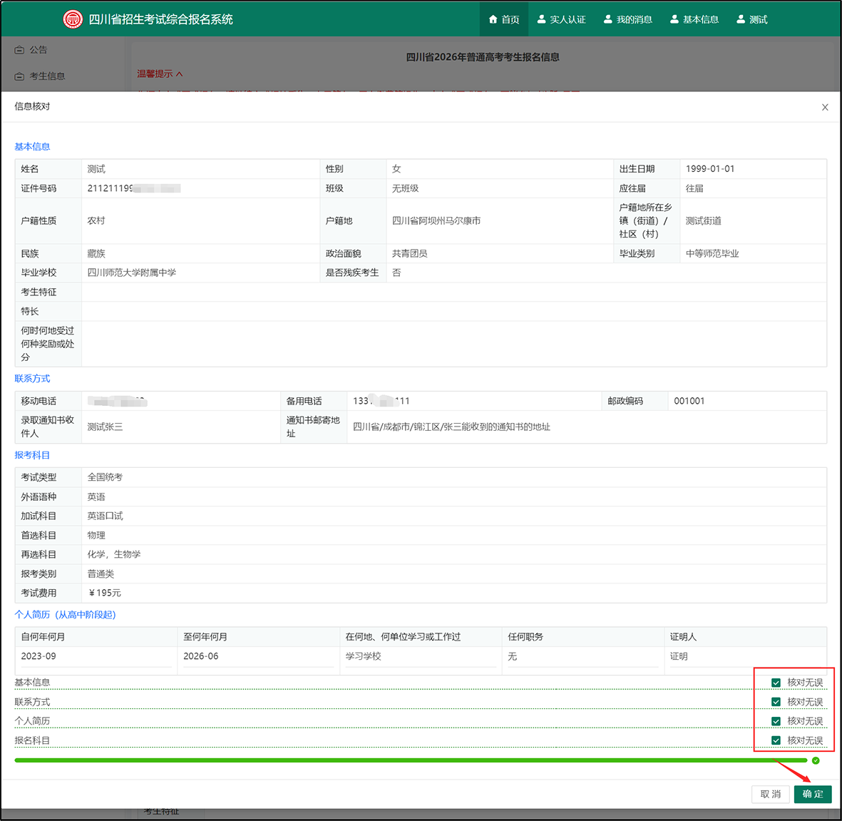 考生签名前再次核对基本信息、联系方式、个人简历、报考科目,每一项勾选“核对无误”后再点击最下方“确定”,弹出签字二维码,考生扫描二维码进行电子签名,注意签名时书写工整。
