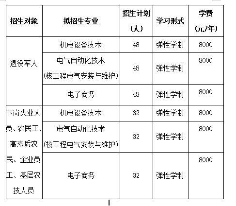 资助政策:学生入学后按现行规定享受学生资助。对于采取弹性学制培养的学生,在校期间参评国家奖学金或国家励志奖学金、国家助学金的次数,享受助学贷款贴息政策的时间,学费补偿、国家助学贷款代偿及学费减免年限,原则上与基本学制学生相同。自主就业(“自主就业”身份由退役军人事务部门认证)的退役士兵专科(高职)学生享受学费减免资助,学费减免按学校实际收取学费金额执行,每生每年最高不超过8000元,超出部分由学生自行负担;全日制在校退役士兵专科(高职)学生全部享受国家助学金。